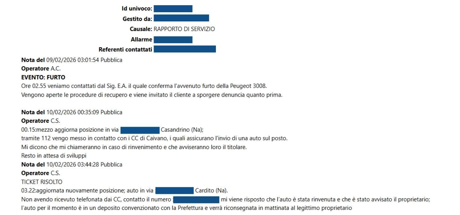 Il nostro operatore attiva la procedura di intervento e invita il cliente a sporgere denuncia il prima possibile, mentre la Centrale Operativa avvia il monitoraggio per il recupero del mezzo.